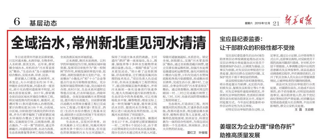12月21日,新華日報第6版基層動態頭條刊登了《全域治水,常州新北重見河水清清》。據報道,在2017年薛家鎮全面啟動的區域水環境綜合整治工程中,維爾利集團水處理團隊負責設計和施工的薛家鎮鳳凰河水環境綜合提升工程、雁蕩河南段水環境綜合提升工程已通過驗收。